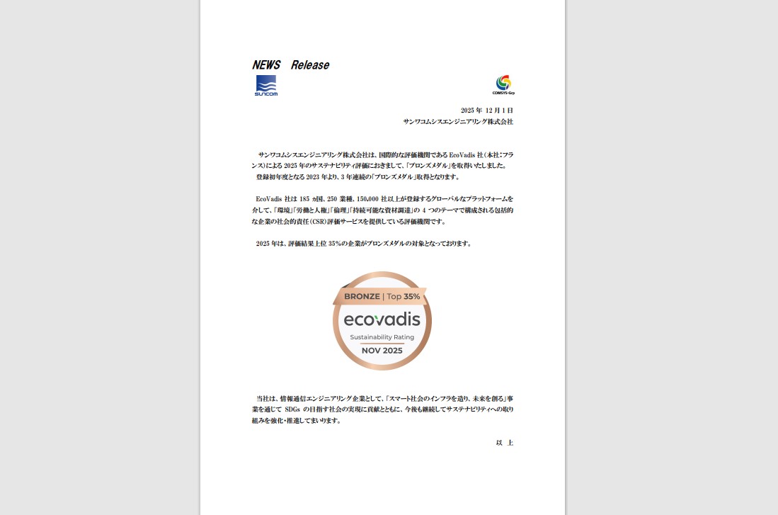 サンコムでは、EcoVadis社〔*1〕によるサステナビリティ評価〔*2〕において、2025年11月29日に「ブロンズメダル」を獲得しました!登録・評価初年の2023年より、3年連続での獲得となります。